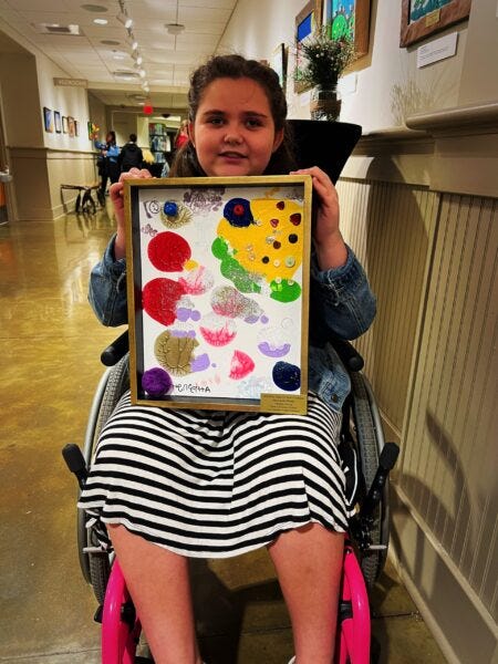 The Helen Keller Art show was in full swing. The center is adorned in art. Tactile pieces. Colorful artwork. Sculptures.