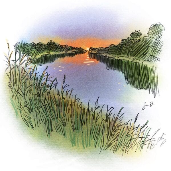 To see that huge ball of brilliant orange light, peeking above the trees, reflecting on the mirrored lake. The orchestra of colors in the sky, as the morning sun lights the clouds from beneath, transforming them into the pink and gold frosting on the Birthday Cake of Life. ...READ MORE...